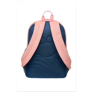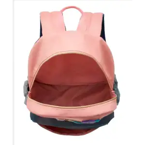 PVC com glitter e verso em velcro. Bolso frontal com logo em alto relevo. Alças com velcro soft. Puxadores de zíper em metal dourado