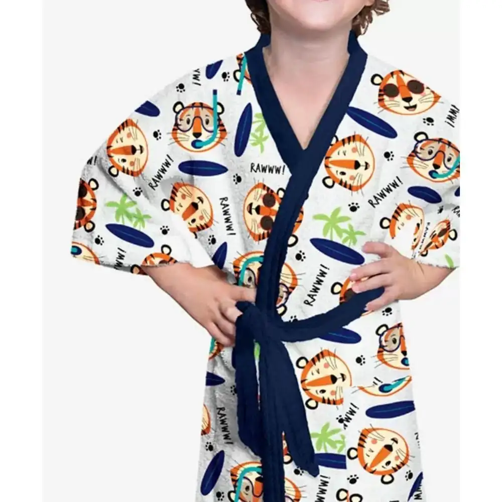 O roupão felpudo da coleção Aventura Radical ilustra a temática super descolada do surf e o mergulho, ilustrando tigres divertidos e pranchas. Ele possui o jeito Lepper, com a exclusiva qualidade da felpa que não desfia, possui ótima absorção e fica mais macio a cada lavagem. A hora do banho ou saíd...
