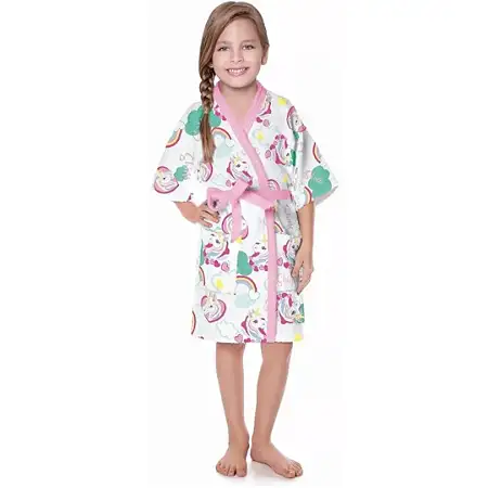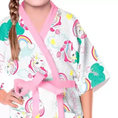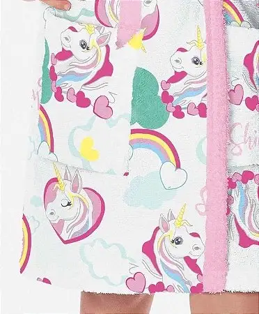 O roupão felpudo infantil Doce Fantasia ilustra o mundo mágico dos unicórnios em tons de rosa neon, rosa claro e verde água, cercado por corações e arco-íris. Ele possui o jeito Lepper, com a exclusiva qualidade da felpa que não desfia, com secagem rápida, possui ótima absorção e fica mais macio a c...
