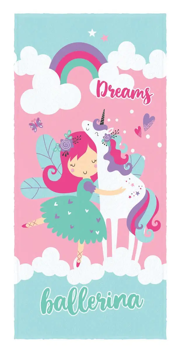 Toalha Felpuda Estampada da coleção Sonho encantado estampa com muita fofura, uma delicada fada bailarina e seu unicórnio mágico.